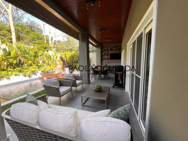 Quintal com churrasqueira, piscina com aquecimento e paisagismo pronto.